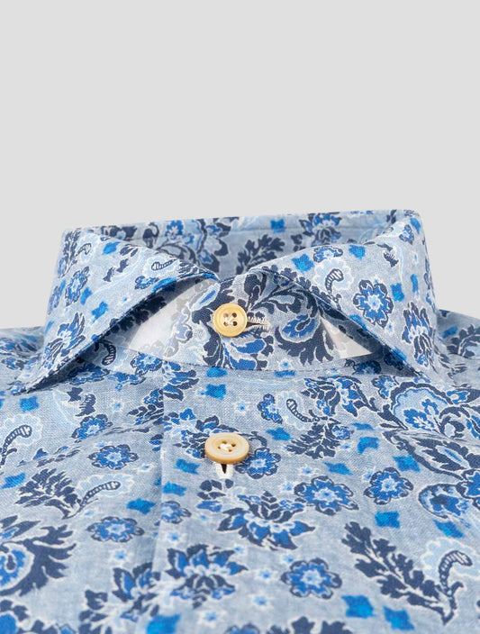 Kiton Blue Linen Shirt - Italian Handmade Floral Pattern