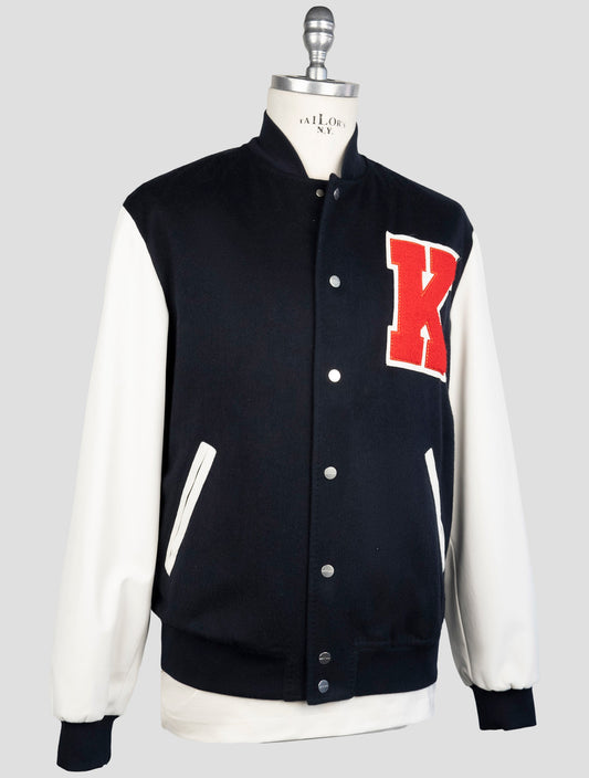 Kiton Blue White 100% Cashmere Coat Leather Trim Italian Luxury