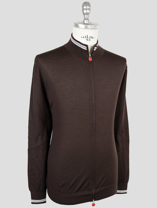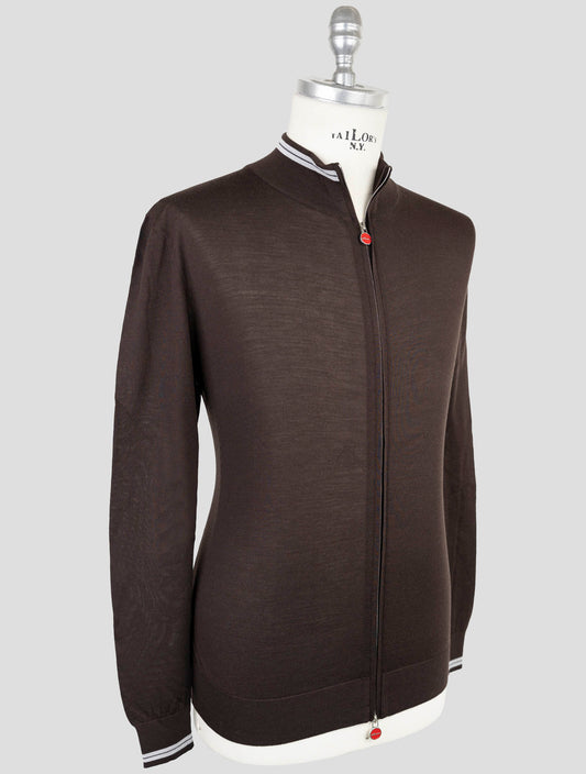 Kiton Premium Brown Wool Full Zip Sweater Diamante Blu Accents
